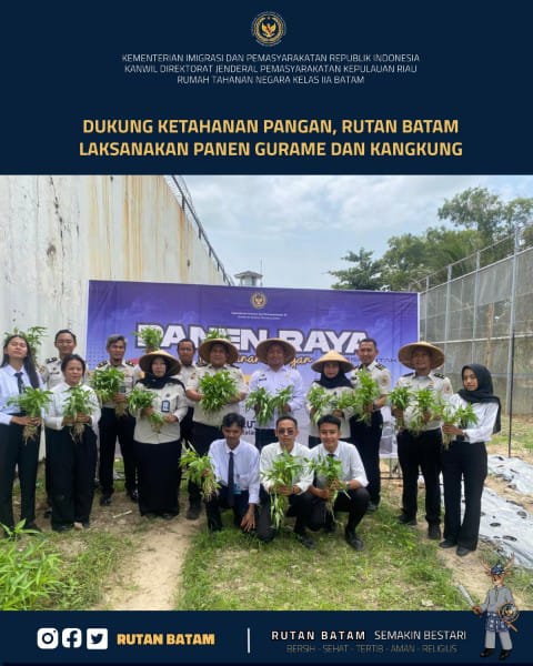 Panen raya tersebut dilaksanakan di area kebun Rutan Batam dengan melibatkan petugas serta warga binaan yang mengikuti program pembinaan. Hasil panen ikan gurame dan kangkung ini merupakan hasil dari proses budidaya yang dilakukan secara berkelanjutan dengan pendampingan petugas.
