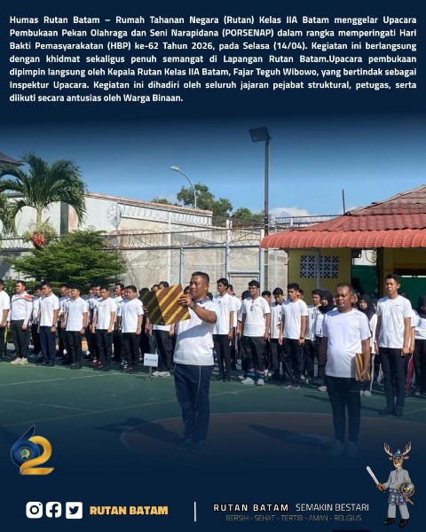 BATAM, KENCANA NEWS.COM – Rumah Tahanan Negara (Rutan) Kelas IIA Batam menggelar Upacara Pembukaan Pekan Olahraga dan Seni Narapidana (PORSENAP) dalam rangka memperingati Hari Bakti Pemasyarakatan (HBP) ke-62 Tahun 2026, pada Selasa (14/04/2026).